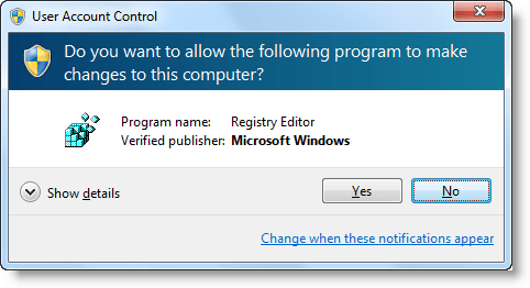 Когда вы войдете в учетную запись администратора на компьютере с Windows Vista или Windows 7 и попытаетесь объединить файл .REG, вы увидите приглашение контроля учетных записей (UAC), запрашивающее ваше согласие на запуск процесса. Regedit.exe использует самый высокий уровень выполнения (как указано в его манифесте) и поэтому запрашивает согласие на запуск с наивысшей доступной привилегией.