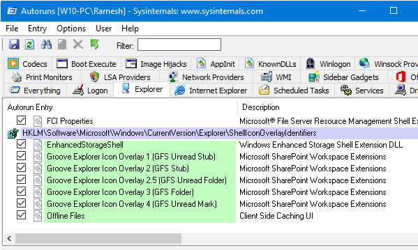 Сортируйте записи по столбцу «Тип», проверьте записи «Обработчик наложения значков», выберите соответствующий элемент. Вы можете отключить их через контекстное меню или панель инструментов.