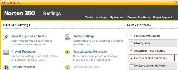 Если вам не нужна функция индикаторов резервного копирования, ее можно отключить, щелкнув «Настройки» в главном окне Norton 360, отключив флажок «Индикаторы состояния резервного копирования» и нажав «Закрыть».